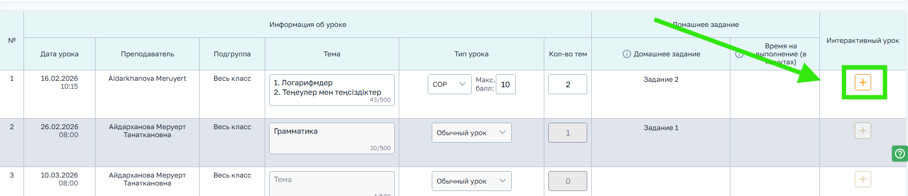 1. В необходимом КТП, в столбце Интерактивный урок нажимаем на Добавить урок.
