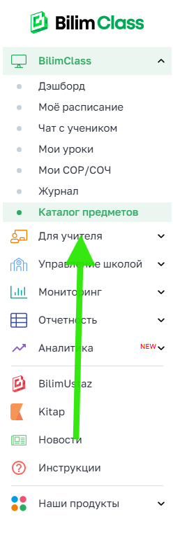 Левое меню → BilimClass → Каталог предметов
